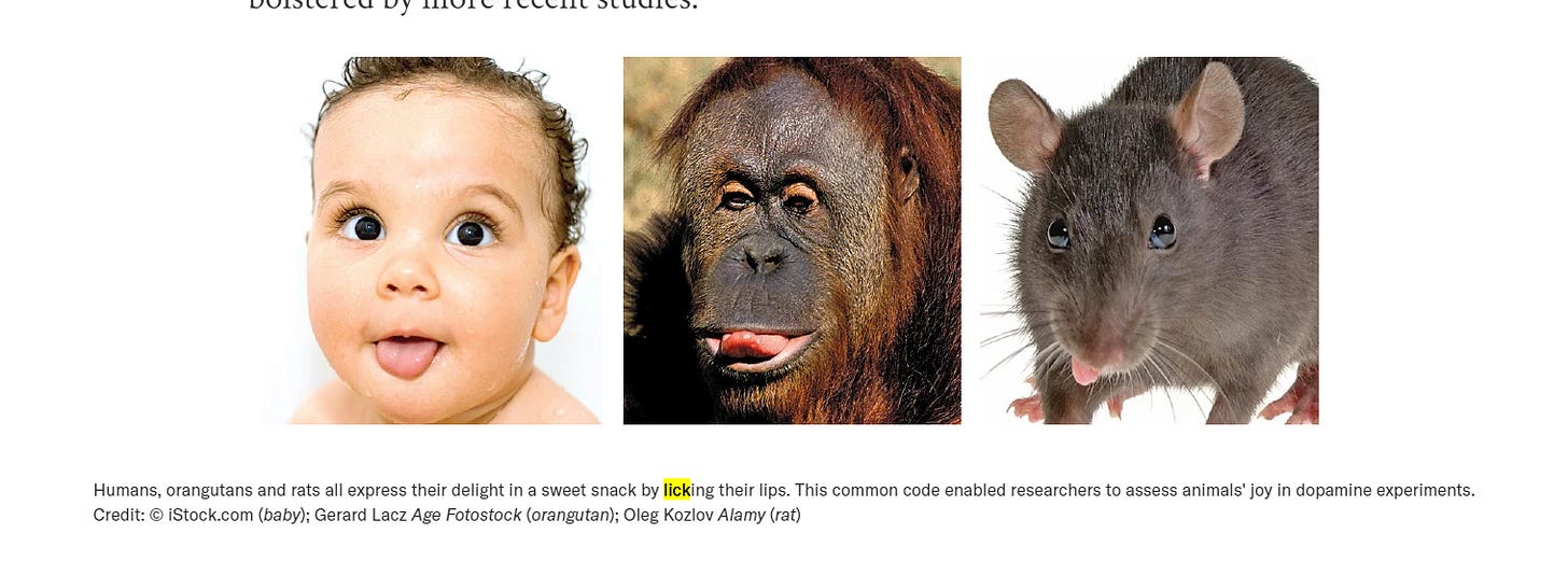 THEN, they took away the rat’s dopamine by doing some unspeakable shit in their brains and then watched to see if the rats would still want to eat any food if it was given to them. And guess what, the rats still loved eating food. This was surprising - scientists thought that no dopamine would mean no enjoyment from the food. BUT the rats still enjoyed the food. How do we know?