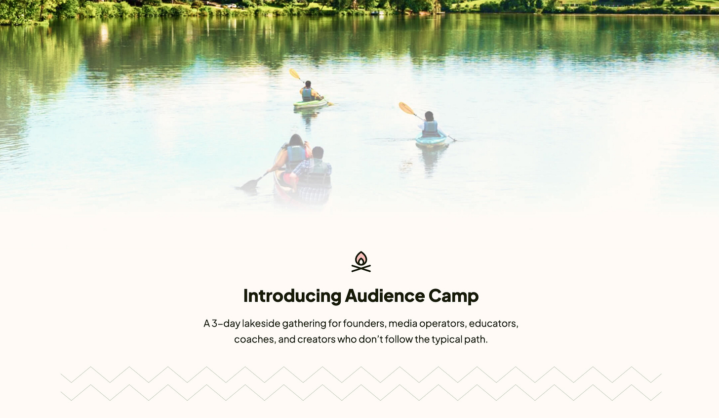 And soon, I shall return to camp: Audience Camp, a "3-day lakeside retreat in Asheville, NC, designed for 6 & 7-figure audience-first businesses that want to scale faster."